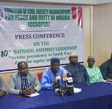 A coalition of civil society organization for peace and unity of Nigeria,has appealed to the president-elect and all stakeholders of All Progressives Congress to zone presidency of 10th Senate to the South East.