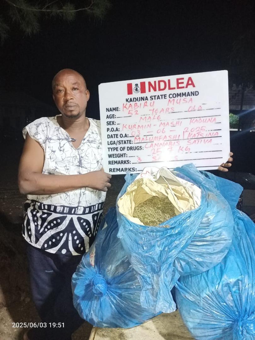 In Kaduna, operatives of the state command of NDLEA on patrol along Abuja – Kaduna expressway on Tuesday 3rd June arrested 29-year-old Goodluck Nnaemeka with 612 bottles of codeine-based syrup and 2,970 pills of flunitrazepam. In another operation same day, a 52-year-old wanted drug dealer Kabiru Musa (a.k.a KB) was arrested at Kurmin Mashi. A total of 25.7kg skunk was earlier recovered from his base.