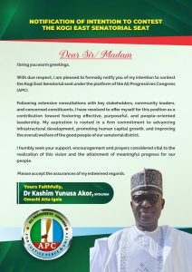 Kogi East 2027; Former DG NPC, Dr Kashim Akor Declares for Senate under APC