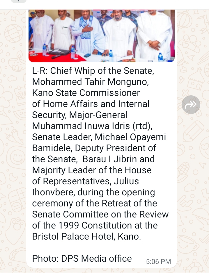 L-R: Chief Whip of the Senate, Mohammed Tahir Monguno, Kano State Commissioner of Home Affairs and Internal Security, Major-General Muhammad Inuwa Idris (rtd), Senate Leader, Michael Opayemi Bamidele, Deputy President of the Senate, Barau I Jibrin and Majority Leader of the House of Representatives, Julius Ihonvbere, during the opening ceremony of the Retreat of the Senate Committee on the Review of the 1999 Constitution at the Bristol Palace Hotel, Kano.