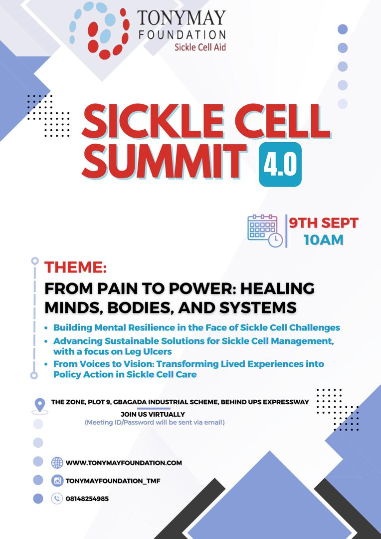 The TonyMay Foundation has announced plans for the 4th Biennial Sickle Cell Summit, scheduled to hold on Tuesday, September 9, 2025, at The Zone, Gbagada, Lagos. This was disclosed in a statement signed by the CEO, Mrs Edith Otokhina in Lagos.