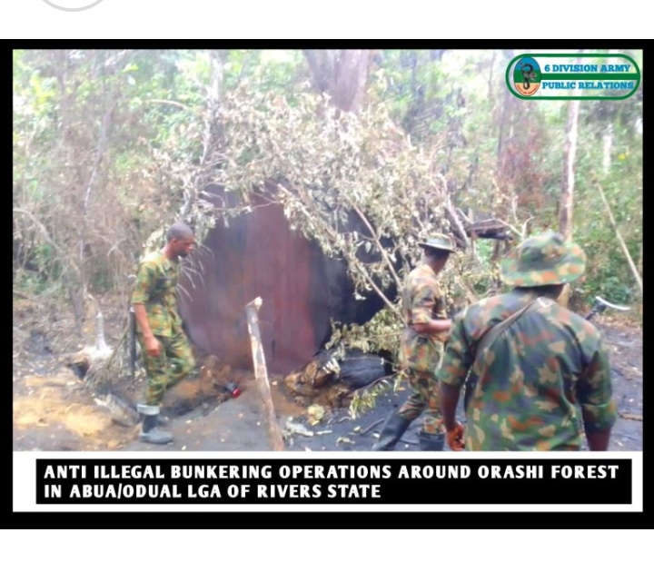 Another major operation at Orashi Forest in Abua/Odual LGA led troops to trace a hose extending over nine kilometres to four illegal refining sites. The sites contained four large ovens with a combined capacity of 120,000 litres, receivers, and dugout pits stocked with more than 7,000 litres of crude oil. A pumping machine and five large reservoirs were also destroyed.