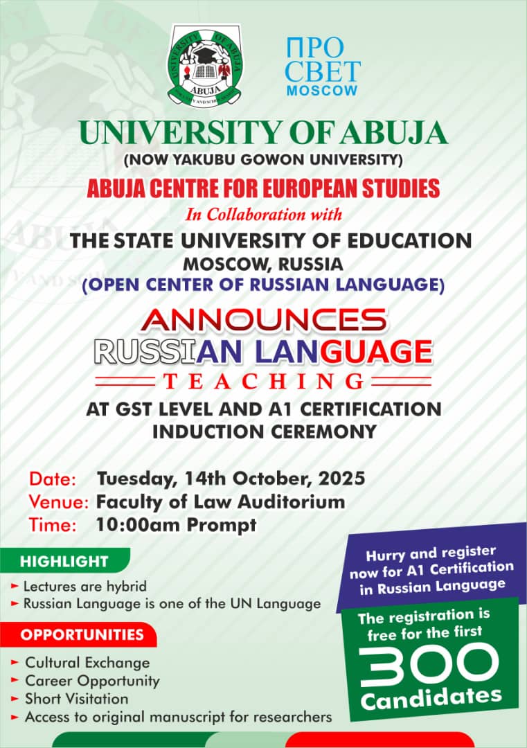 The University of Abuja (now Yakubu Gowon University) has announced the introduction of Russian language teaching at the General Studies (GST) level, alongside an A1 Certification Programme, in collaboration with the State University of Education, Moscow, Russia (Open Center of Russian Language).